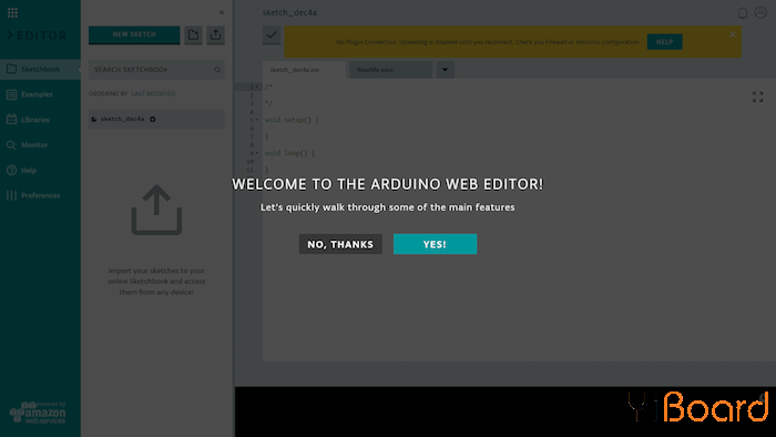 如果您以前从未使用过在线编辑器,则需要安装Arduino Create插件来连接您的开发板。单击Arduino Web Editor框后,系统将要求您登录Arduino帐户。