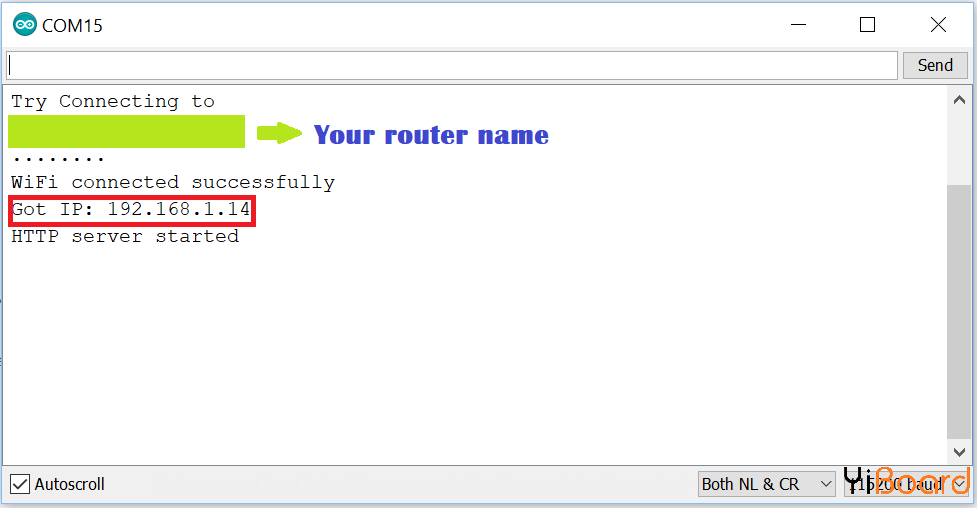 复制代码上传代码后,打开串口监视器窗口。如果您输入了正确的SSID和密码,几秒钟后,ESP32将连接到路由器并返回IP地址。