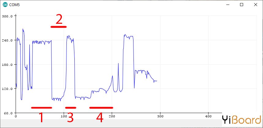 当传感器指向一张蓝纸(图像中的1和3区域)时,测量值将相对较高。但是,一旦我将传感器对准红色,该值就会显着下降(2区域)。4区域的部分显示混合颜色时发生的情况。根据颜色包含的红色量,该值将改变。