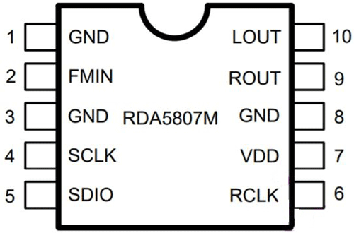 它具有数字低中频架构,并集成了一个低噪声放大器(LNA),该放大器支持FM广播频段(50至115 MHz)、可编程增益控制(PGA)、高分辨率模数转换器和高保真数模转换器(DAC)。限幅器可防止过载,并限制相邻通道产生的互调产物的数量。 PGA放大混频器输出信号,然后用ADC数字化。 DSP内核管理通道选择、FM解调、立体声MPX解码器和输出音频信号。该IC的RDA5807引脚排列图如下。