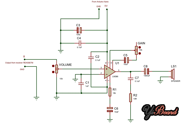 Arduino FM接收器电路图 我们使用了两个电位器来调节FM频段和控制音频放大器的音量。要更改音量,您可以改变电位器,电位器连接在LM386的1至8号引脚之间,也可以改变电位器,其连接在LM386的3号引脚之间。下图显示了Arduino FM收音机的完整电路图。