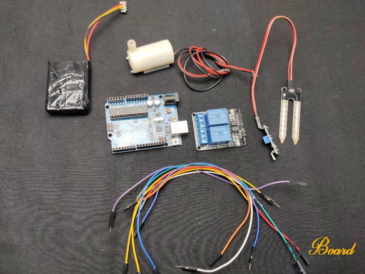 所需的组件 本文需要的组件很少,连接也很简单。下面列出了这些组件: ● Arduino UNO开发板 ● 湿度传感器 ● 5V继电器模块 ● 6V mini水泵 ● 连接线 ● 5V电池