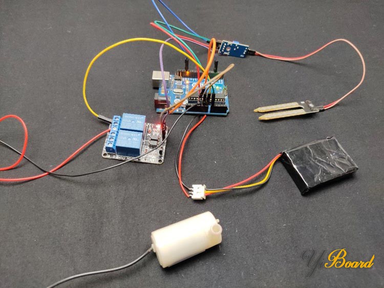 为了给电路供电,我使用了外部电池。您可以使用9伏或12伏电池。电池连接到Arduino的Vin和接地引脚,我们也可以通过继电器将电机连接到该电池。湿度传感器输出连接到Arduino的模拟引脚。请记住使用Arduino的5伏引脚为传感器和继电器模块供电。