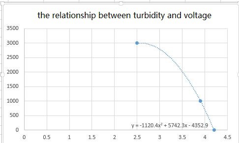 浊度与传感器电压的关系 从DfRobot这篇文章中,我得到了这张图表,其中包含一个将传感器电压与浊度相关联的方程。