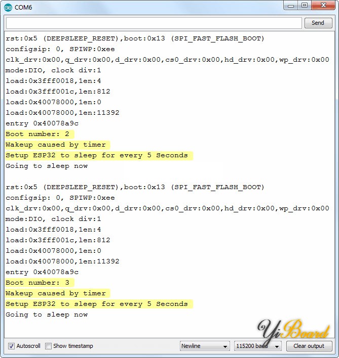 此示例使用从微秒到秒的转换系数,因此您可以在time_to_sleep变量中以秒为单位设置睡眠时间。在这里,ESP32进入深度睡眠模式5秒钟。 - #define uS_TO_S_FACTOR 1000000ULL /* Conversion factor for micro seconds to seconds */