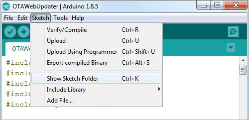 草图成功编译后,就会在草图文件夹中生成.bin文件。 转到Sketch > Show Sketch Folder。
