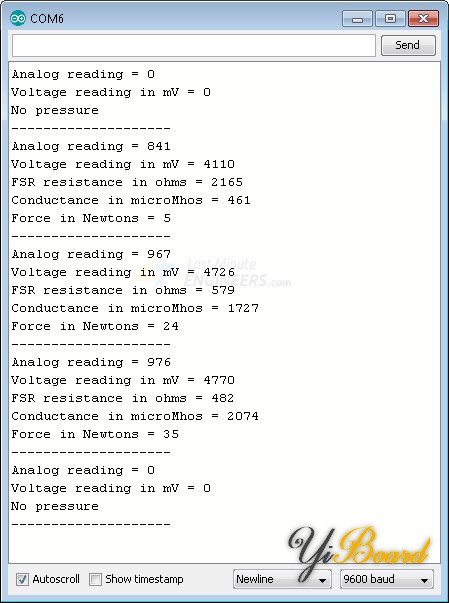 如前所述,传感器的输出电压为0V(无压力)和大约5V(最大压力)。当Arduino将此模拟电压转换为数字时,它实际上将其转换为范围0到1023的10位数量。因此,根据挤压力程度,您将在串口显示器中看到0到1023之间的值。 - fsrReading = analogRead(fsrPin);