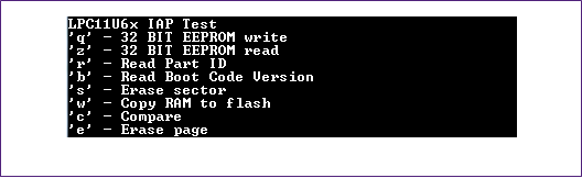 5.3 应用示例 演示软件发送一个菜单系统到PC,通过UART连接,以9600波特率。演示软件演示了IAP调用: • EEPROM写入 • EEPROM读取 • 读取器件的部分ID • 读取启动代码的版本 • 擦除扇区 • 从RAM复制内容到闪存 • 验证在存储区位置的数据 • 擦除页 下图显示了在PC上使用Tera Term的 UART菜单显示。
