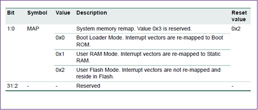5.1.2 中断重映射 在NXP的LPC11U6x上系统重映射寄存器SYSMEMREMAP选择异常向量是从引导ROM读取或是闪存、SRAM。默认情况下,闪存映射到地址0X0000 0000。当寄存器SYSMEMREMAP中的MAP位设置成0x0或者0x1,引导ROM或者RAM分别映射到存储器映射的底部512字节(地址0x0000 0000到0x0000 0200)。