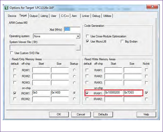图2. Keil IROM和SRAM重映射 在LPCXpresso IDE中,通过改变MCU的设置实现相同的任务。