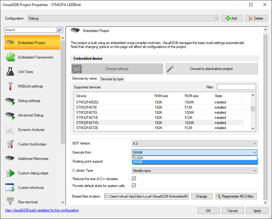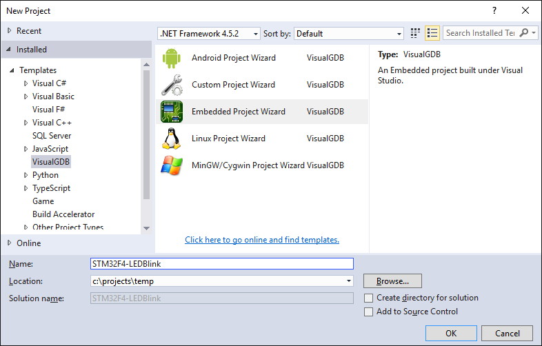 2. 选择VisualGDB - >Embedded Project Wizard。选择一个目录和项目名称:
