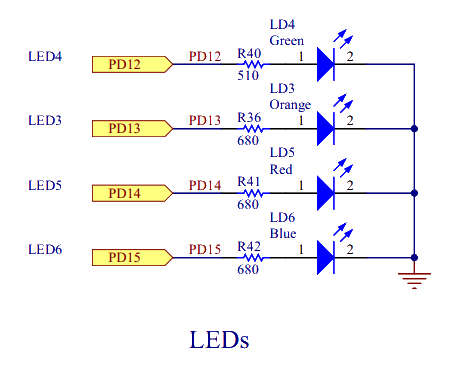 6. STM32F4-Discovery探索板包含4个LED,分别连接到PD12-PD15引脚(详细信息请参阅电路板的原理图):
