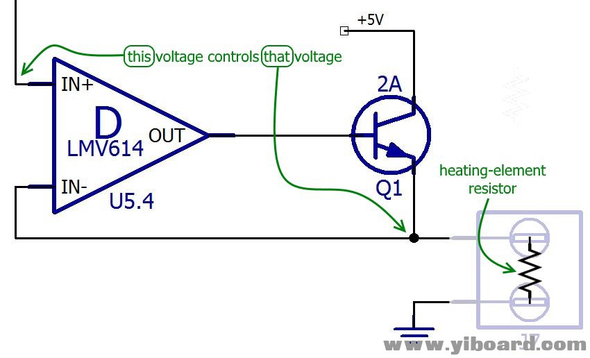 我们可以简单地使用运算放大器缓冲DAC输出,但运算放大器的输出电流容量也不足。所以你在这里看到的是增加运算放大器驱动能力的标准电路。 BJT可以维持2 A的连续集电极电流,这对我们的目的来说已经足够了。控制电压(即DAC输出电压)加到运算放大器的正输入端。一般电路配置是单位增益电压跟随器,但请注意反馈信号(连接到运算放大器的负输入)如何来自施加到加热元件的电压,而不是来自运算放大器输出端子的电压。这种布局告诉运算放大器以任何必要的方式调节其输出电压,以确保施加到加热元件的电压与控制电压相同。