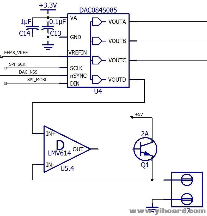 DAC是一个8位电压输出器件,由EFM8微控制器通过SPI控制。参考电压(由EFM8提供)为2.4 V,因此DAC的输出范围为0 V至2.4 V,精确度为(2.4 V)/(28)= 9.4 mV。微弱的DAC输出驱动器可以连续提供大约10 mA的电流,而我们的电阻器只需10 mA就不会产生太多的热量。在这里,我们使用了运算放大器和BJT(Diodes Inc.的 DSS20201L)。