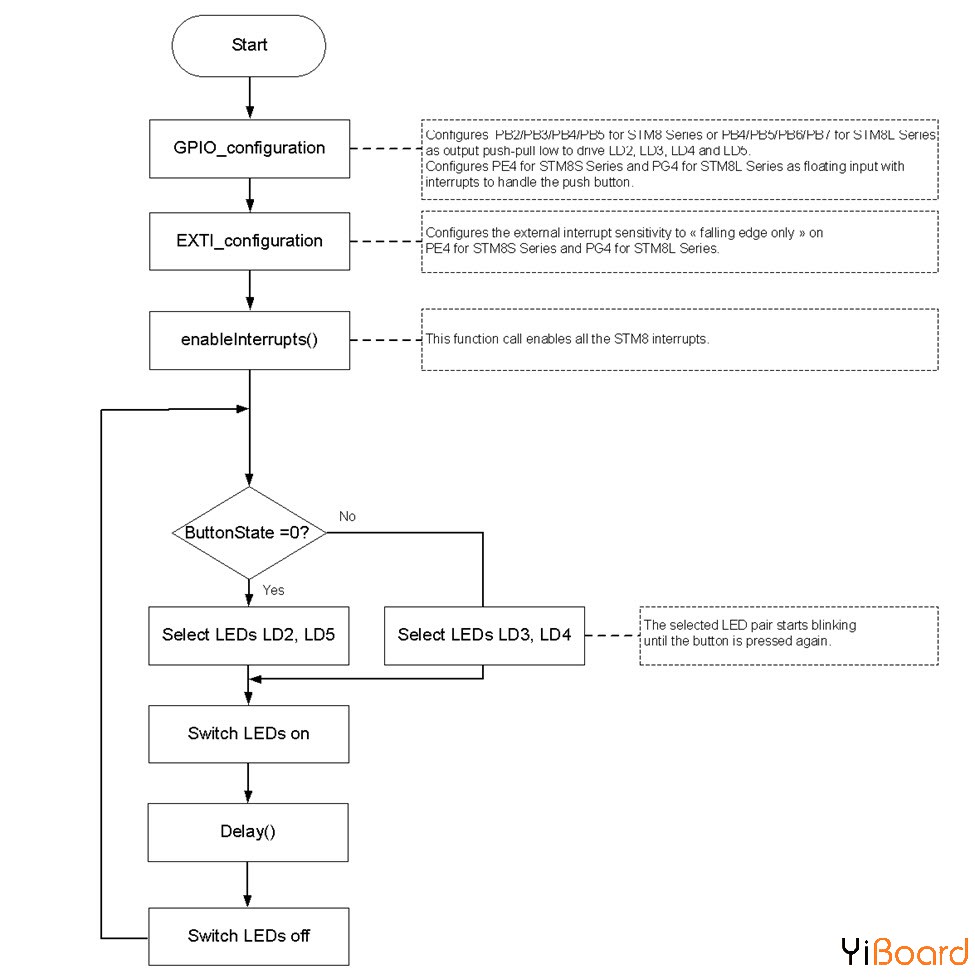 外部中断控制器通过EXTI_SetExtIntSensitivity()函数配置来处理按钮上的外部中断(STM8S208RBT6为PE4,STM8L152R8T6为PG4)。