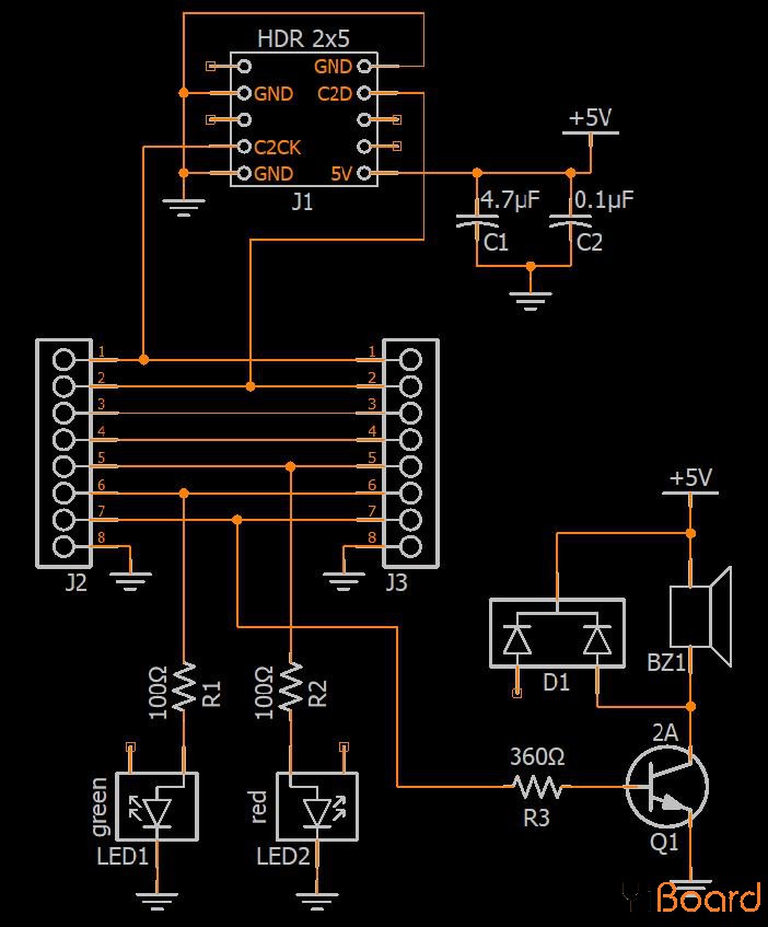 我更喜欢Silicon Labs微控制器,所以我设计了一个C2适配器板。 “C2”是SiLabs的双线编程/调试接口的名称,专为低引脚数MCU而设计。这是原理图: